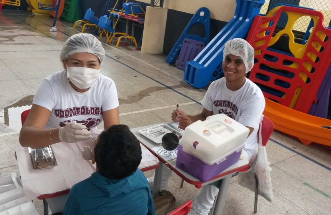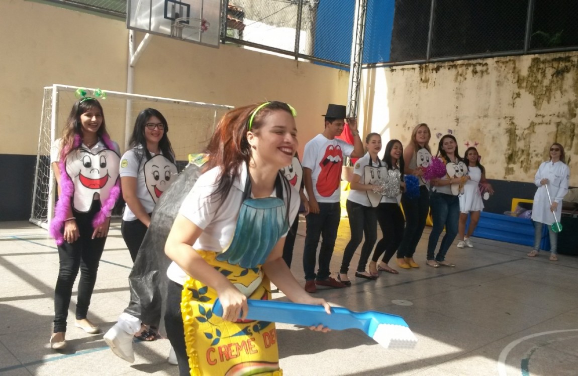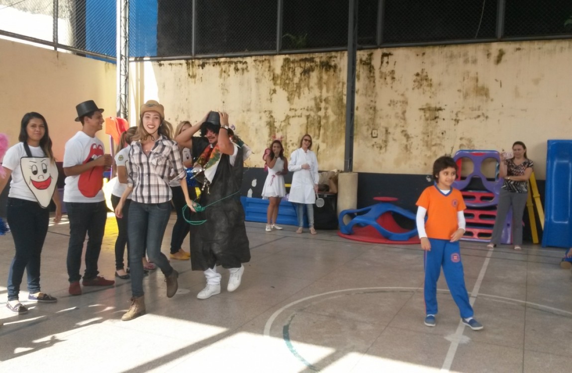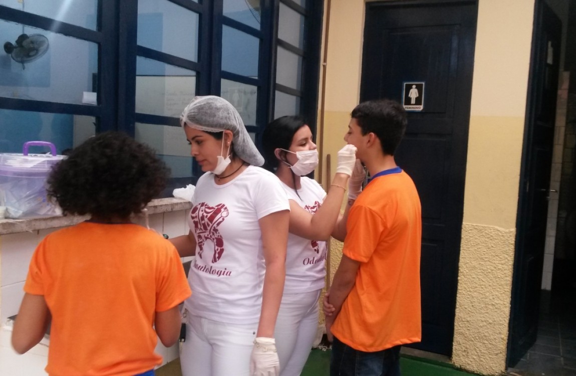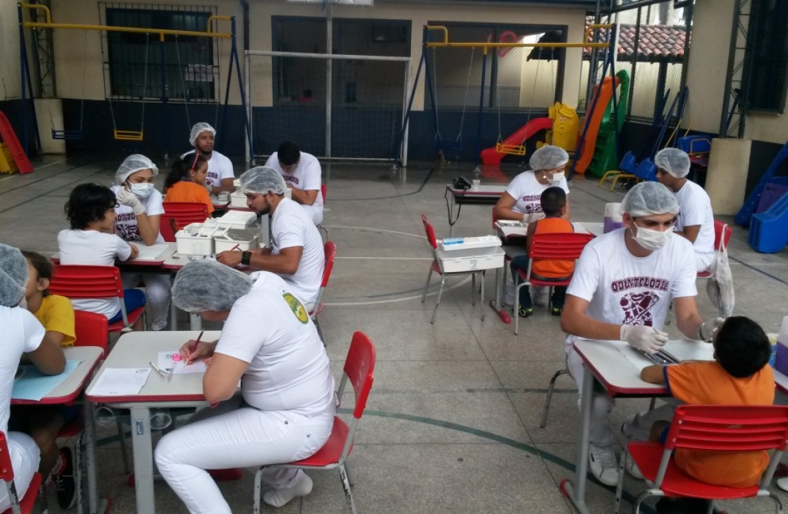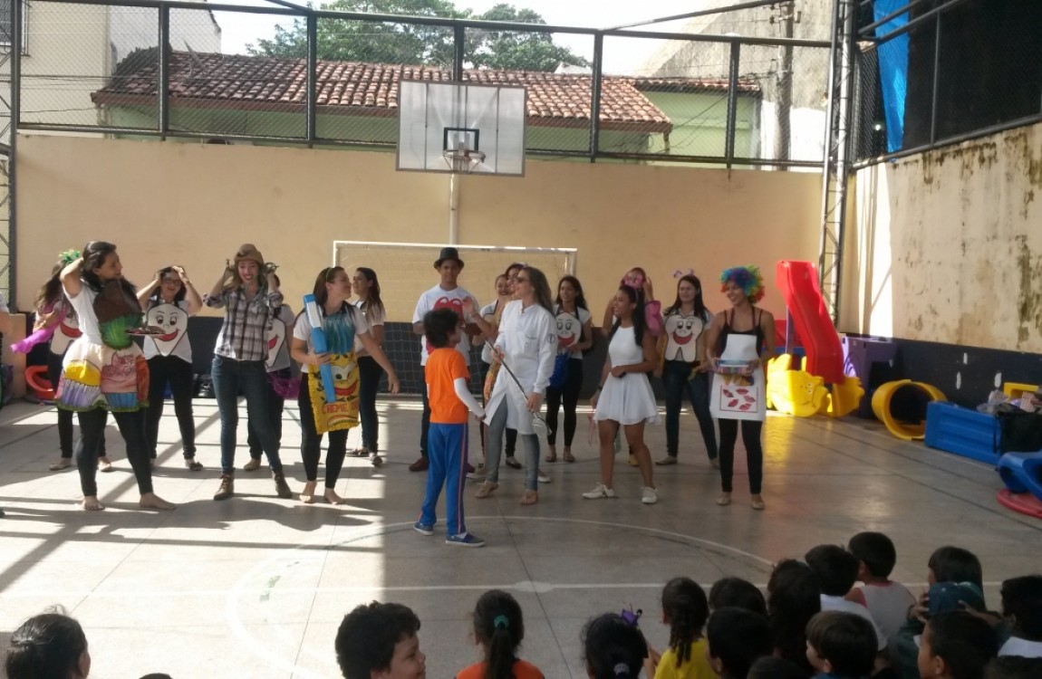 Entre as atividades realizadas pelos alunos do 3º semestre do curso de Odontologia estão: integração com os estudantes da escola através de uma peça teatral que fala de saúde bucal; exame clínico nas crianças, escovação supervisionada e aplicação de flúor nos participantes.