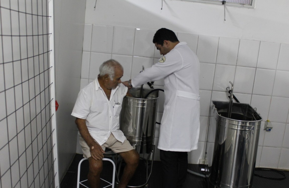 Um dos pacientes dele é seu Raimundo Alves Paiva, 74 anos, que está com suspeita do Síndrome do Túnel do Carpo, doença que provoca muitas dores na mão e no braço. Durante as sessões de fisioterapia ele faz exercícios com a mão dentro da água morma.